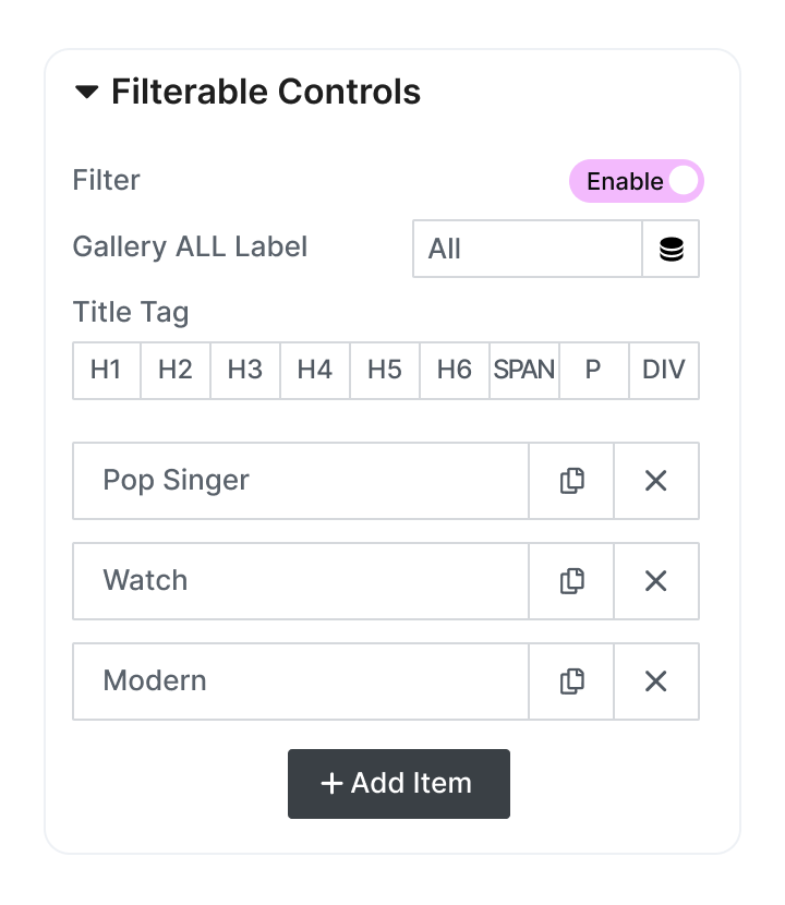 Let your users filter gallery images in real-time, making it easier to explore relevant visuals without any hassle. Disable the filter option if needed.