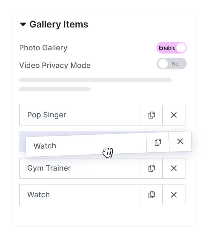 Effortlessly organize your gallery by simply dragging and dropping items, giving you full control over layout and visual flow.