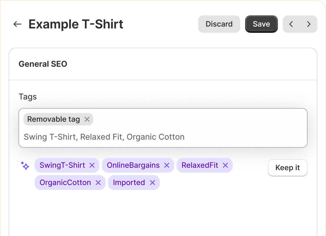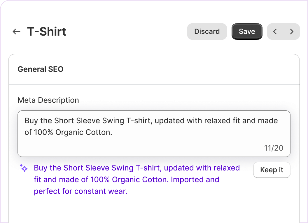 Unlike static AI content generators, StoreSEO AI Optimizer will provide highly optimized metadata just like an SEO expert.