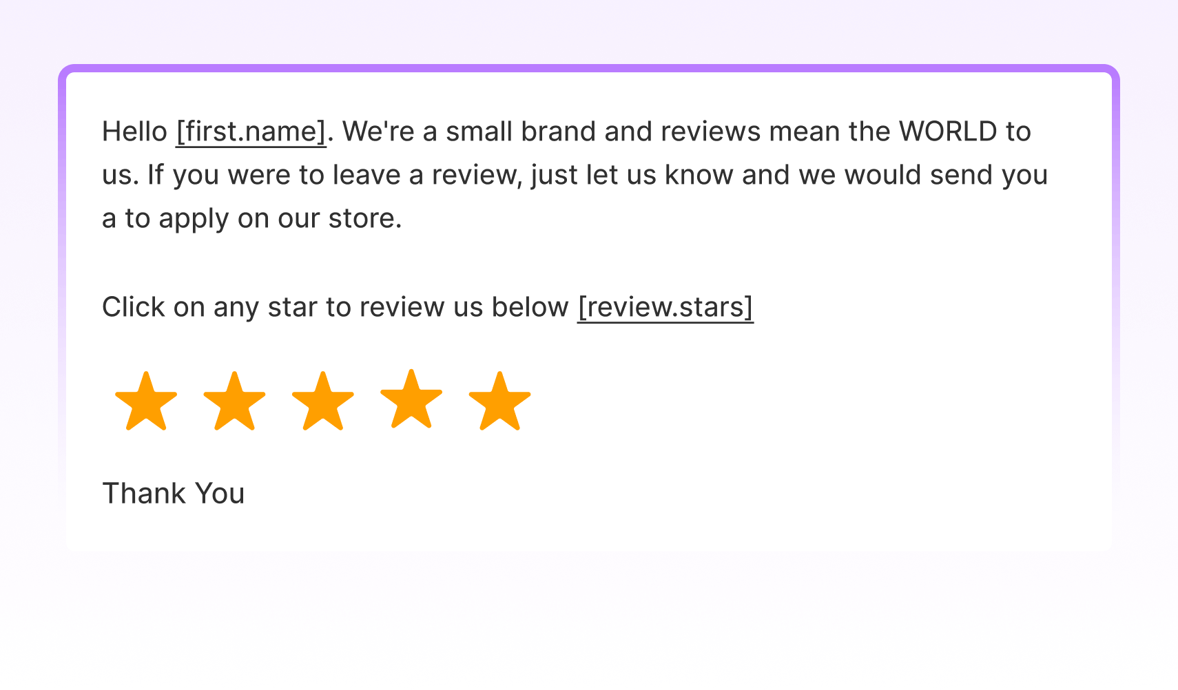 Make your review request email stand out with dynamic placeholders, trendy rating emojis, business logos, typography, color, and more; design without limitation.